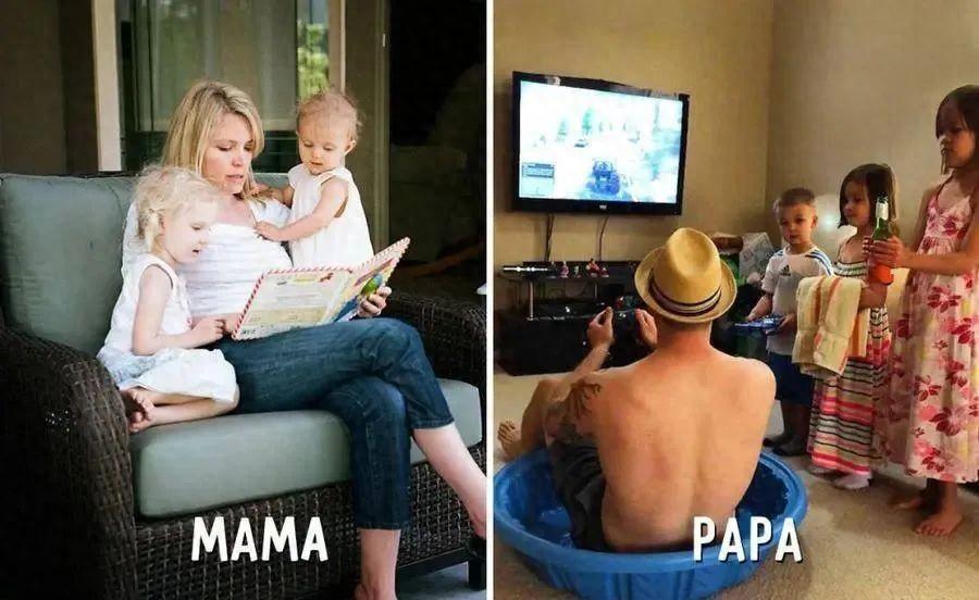 國外也經常有這種“媽媽帶娃vs 爸爸帶娃”的對比圖 | babycouture.in