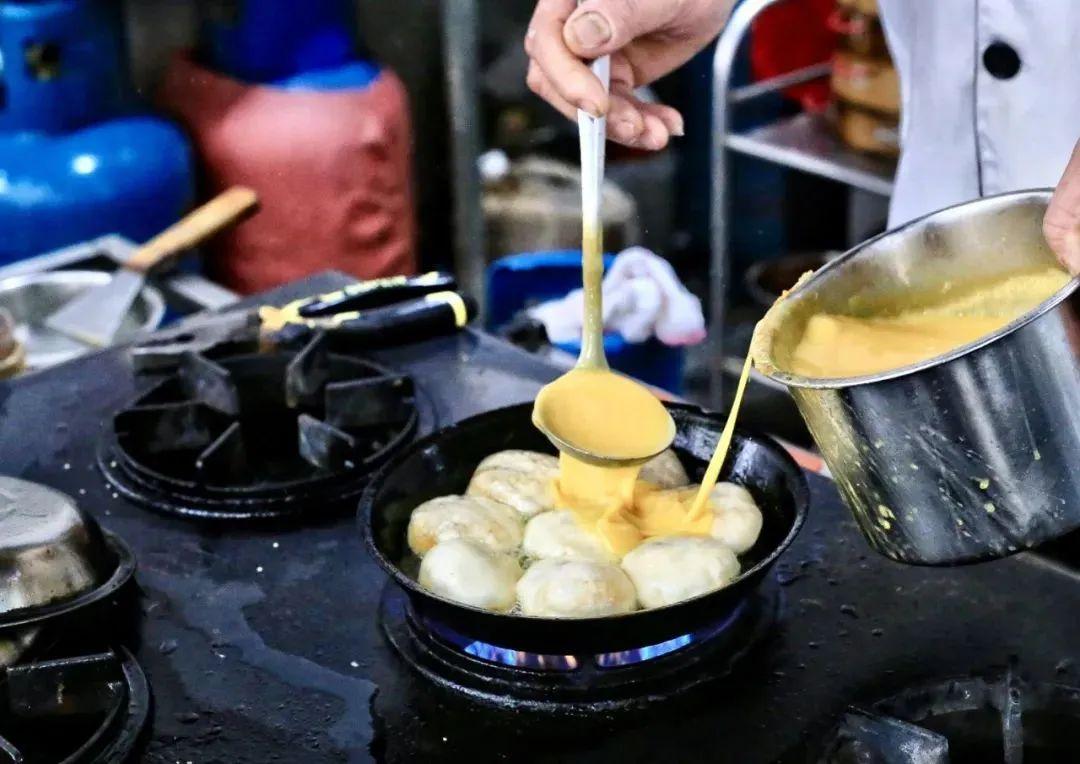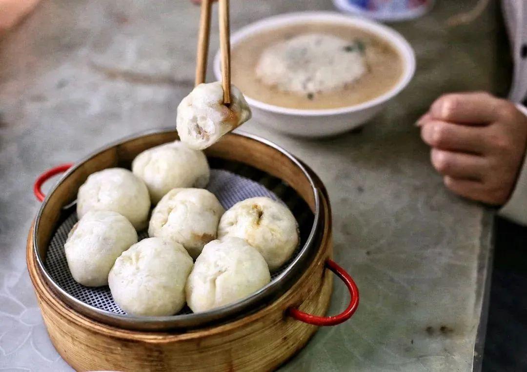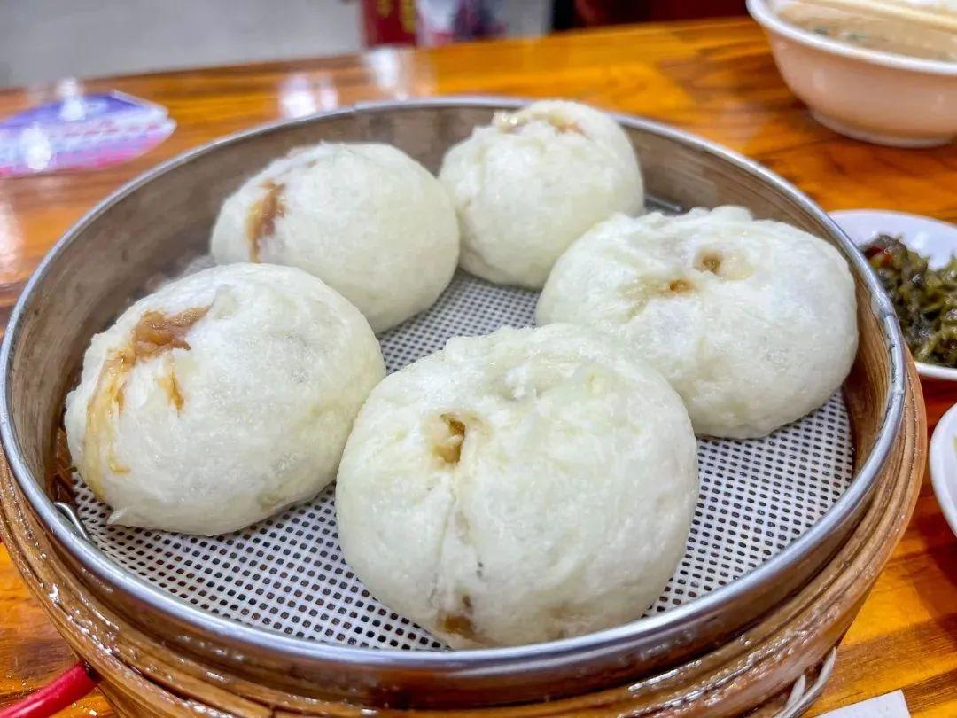 店的名氣在外,過了早上8點,這裏已經開始排隊。生煎豆腐包幾乎是人人必點的招牌,店裏是開放式廚房,我站在外面看着裏面同時十幾個師傅熱火朝天的包包子和煎包子行雲流水:包子蒸至半熟後移至鐵板,淋上蛋液煎至底部金黃酥脆;這樣能讓蛋香滲入薄皮,喫進嘴裏就有了“上軟下脆”的層次感。豆腐做內餡的確要比純肉多了幾分滑嫩,加了點肉沫提鮮,一入口,就是香脆鮮軟多汁料滿,各種層次體驗都有了,不愧爲當地一絕。