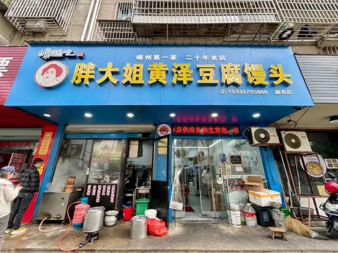 還有一家我離開嵊州後喫不到的,是胖大姐黃澤豆腐饅頭。豆腐做餡料,卻能把包子做得比肉餡的還好喫。據說這家包包子的大姐原來是位海鮮商販,1997年轉行賣包子,多次改良將發麪厚皮改爲薄皮帶湯版本,做出了一種餡嫩湯鮮的黃澤豆腐包味道。
