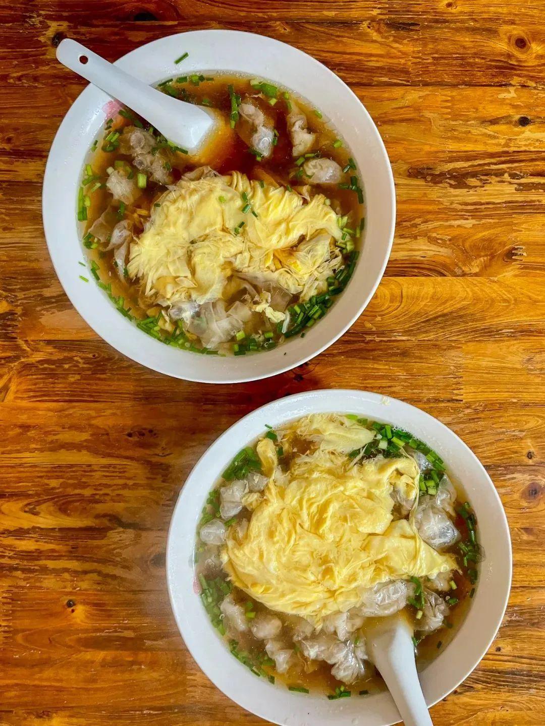 幾分鐘後,一盤餛飩就好了,她往燒開的湯鍋裏一倒,一煮,調料一拌一撈;上面再燙了份金燦燦的鴨蛋,撒上點蔥花,就把這碗端到我們面前。