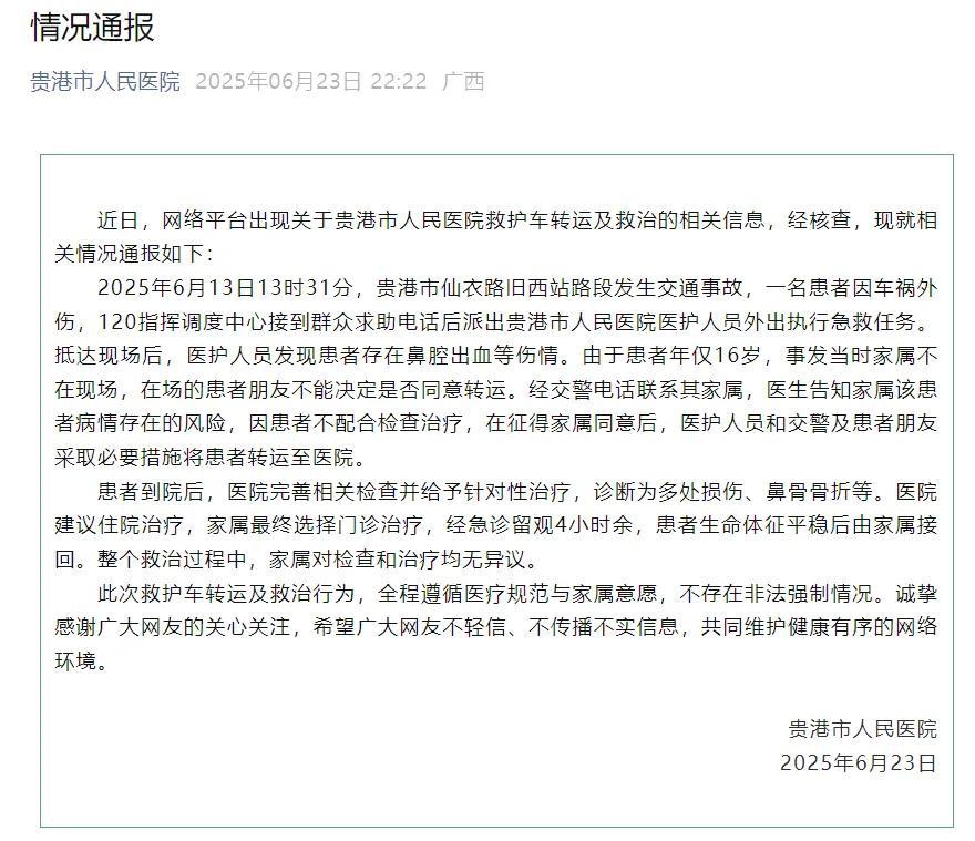 經公安部門覈實,2025年6月13日13時31分,貴港市港北區仙衣路舊西站路段發生交通事故,一名女子(視頻中傷者)駕駛電動車與一輛小型普通客車碰撞,致該名女子受傷,交警配合醫護人員開展救援。經醫院檢查,該名女子僅爲輕微傷,家屬當晚接其出院休息。