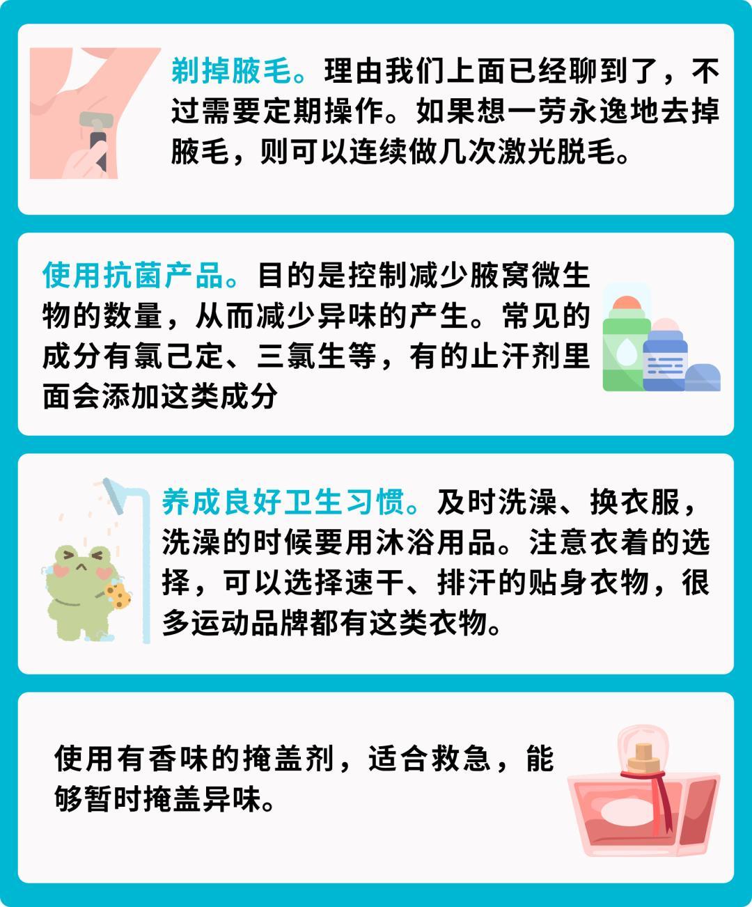 而對於汗臭,只要注意衛生,保持腋下清爽,再配合一些小妙招,比如剃腋毛、用止汗劑等措施,就能輕鬆應對汗臭問題,無論如何,別讓腋下的小煩惱影響了自己的好心情。