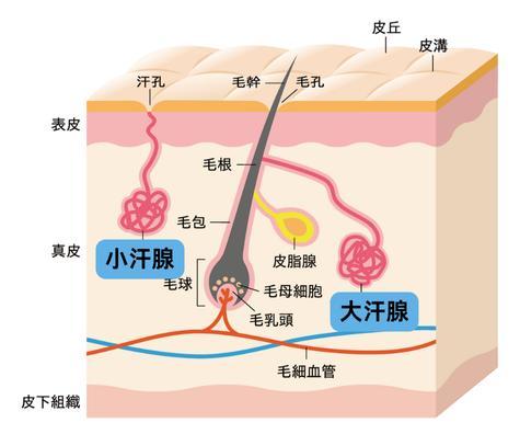 腋窩的特點是同時有兩種汗腺,一種與腋臭有關係,叫做大汗腺,另一種和常見的汗臭有關係,叫做小汗腺。