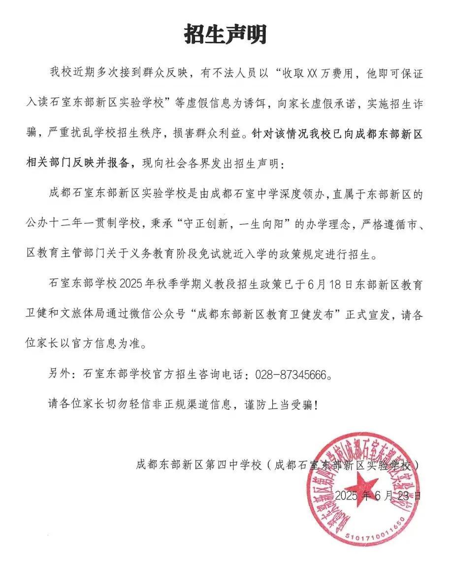詳情:6月23日,成都東部新區第四中學校(成都石室東部新區實驗學校)通過微信公衆號“石室東部學校”發佈招生聲明,全文如下: