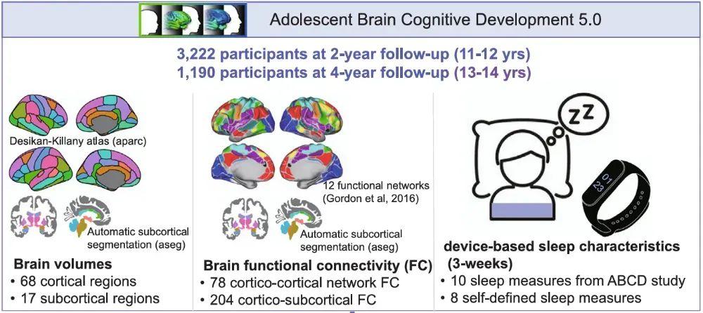 研究者選取 3222 名 11 至 12 歲的青少年作爲發現樣本,並進行爲期兩年的隨訪。同時選取 1190 名 13 至 14 歲的青少年作爲驗證樣本,進行兩次重複研究即四年的隨訪,以獲取高可信度的多項認知表現和學業成績等信息數據。在研究期間,研究者通過讓受試者佩戴智能化設備來採集包括睡眠週期、生理信號及行爲模式等多個維度在內的客觀睡眠特徵信息。同時,利用磁共振成像技術分析不同腦區體積及不同區域之間的連接性。