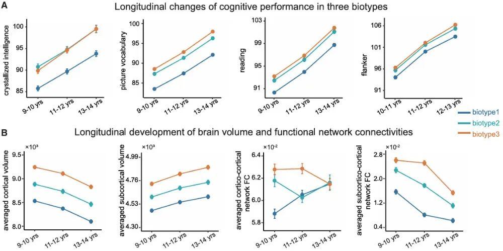 三種年齡層青少年認知表現的縱向變化以及大腦體積和功能網絡連接性的發育情況(Longitudinal changes of cognitive performance in three biotypes:三種年齡層青少年認知能力的縱向變化情況;crystallized intelligence:晶體智力;Longitudinal development of brain volume and functional network connectivities:大腦體積的縱向發育及功能網絡連接性;averaged cortical volume:平均腦皮質體積)圖片來源:參考文獻[1]
