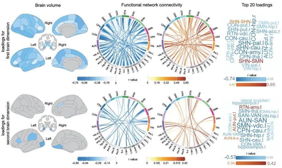 腦容量模式和功能網絡連接性與睡眠相關維度之間的關聯(Brain volume:腦體積;loadings for first brain dimension:腦的第一個關聯維度;loadings for second brain dimension:腦的第二個關聯維度;Functional network connectivity:功能網絡連接性;Top 20 loadings:變量之間相關程度最大的 20 個指標)圖片來源:參考文獻[1]