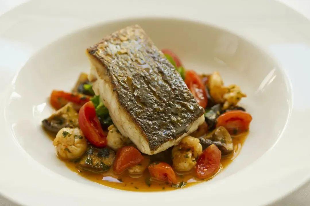 用番茄,蘑菇和荔枝做的鱸魚片 | stockfood / 圖蟲創意