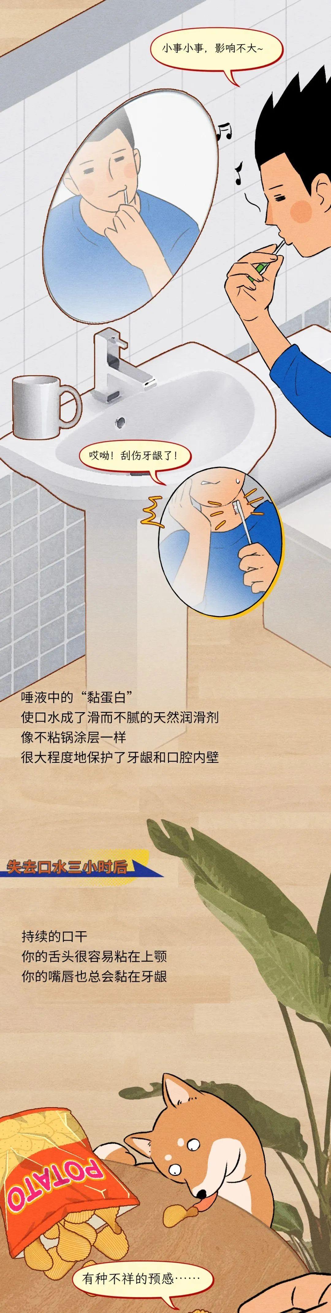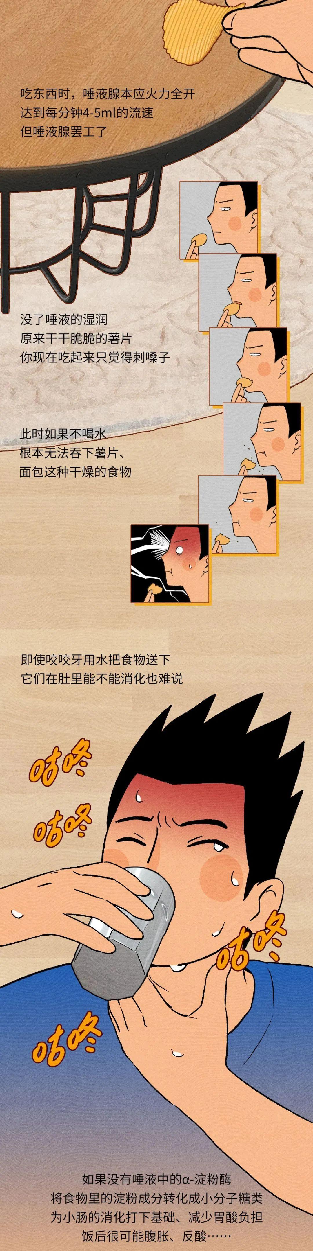 先天疾病、癌症、藥物副作用,甚至年齡增長、生活壓力,都可能導致口乾燥症。據統計,全球超10%的成人會出現口乾燥症,50歲以後,發生率更是達到了約25%。科學家嘗試了多種多樣的模擬唾液手段,但至今無一能完美替代珍貴的唾液。此外,口水過多也應引起注意,唾液分泌過多一般是由於飲食因素所致,也可能由口腔疾病、物理刺激引起。