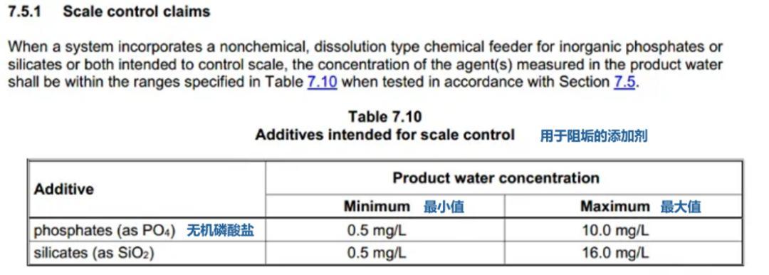 水中微量磷酸鹽設定了嚴格的限制值,只要在合理劑量內,其對人體健康的風險非常低。淨水器採用阻垢劑原本是一種安全的技術,國際美國國家衛生基金會(NSF)的《飲用水處理裝置-感官影響》(Drinking Water Treatment Units - Aesthetic Effects)標準規定產出的水中,磷酸鹽的限值最小爲 0.5mg/L,最大限值爲 10mg/L(這個標準是從口感出發的,不符合標準的水喝起來會有怪味,這裏作爲上限參考)。