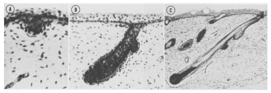 胎兒頭頂後方頭皮中毛囊的發育過程。圖 A 爲 10 周,圖 B 爲 16 周,圖 C 爲 18 周。隨着毛囊的向下生長,毛囊逐漸愈加傾斜。論文作者推測這一改變由皮膚受到牽拉所導致。圖片來自參考文獻[1]