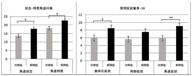 結果發現,比起對照組,病例組表現出了明顯更高水平的焦慮、抑鬱和軀體化症狀(即一些沒有明確病因的身體不適症狀,如頭痛、肌肉痠痛和頭暈等,一般認爲是心理困擾的外化表現)。同時,STAI評估的結果還顯示病例組不僅表現出了較高的焦慮狀態,而且有着更強的焦慮特質,這指的是個體長期的焦慮傾向,被認爲是一種相對穩定的人格特質。