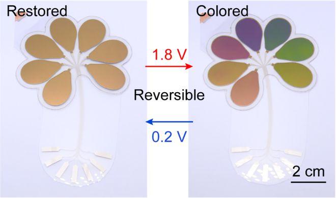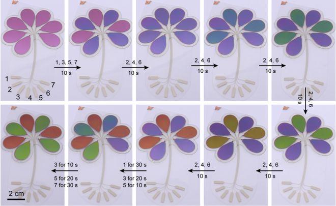 該技術無需藉助彩色濾光片即可實現彩色顯示。研究員將器件製成“七色花”形狀,可以實現多種顏色動態變化。將每個電致變色器件作爲單個像素點,製備成像素陣列顯示原型器件,不僅可以呈現豐富的顏色變化,還可以通過電化學手段進行信息的寫入(變色)和擦除(褪色),從而實現數字化顯示效果。