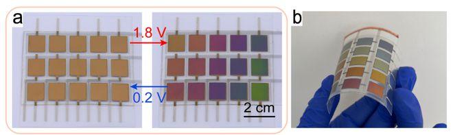 得益於這種新型電致變色策略,研究員製造出的電致變色器件不僅能在同一器件中實現從黃色到綠色七種顏色的連續、動態色彩轉變,還具備出色的電致變色性能表現。