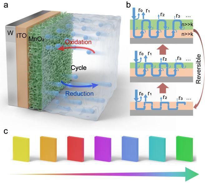 研究員在電致變色電極表面搭建了一個叫“法布里-珀羅諧振腔”的光學結構,根據薄膜干涉原理,通過改變諧振腔中介質層的厚度,即可精準控制反射光的顏色,從而決定我們所看到的顏色。基於此,研究員利用介質層材料(二氧化錳)的可逆電化學沉積-溶解特性,提出了一種在電極表面原位重構法布里-珀羅諧振腔的新型電致變色策略。這種電致變色策略以一個簡單的過程,實現了器件顏色的多樣化轉變。