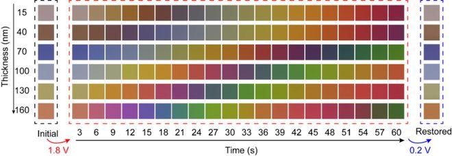 基於上述電致變色原理,研究員利用電化學手段精確控制二氧化錳層的厚度,在同一電致變色器件中實現了從黃色、橙色、紅色、紫色、藍色、青色到綠色的連續、動態色彩轉變。不僅可以展現出7 種典型顏色,其中過渡色(例如橙黃色、黃綠色、紫紅色等)也都可以呈現。