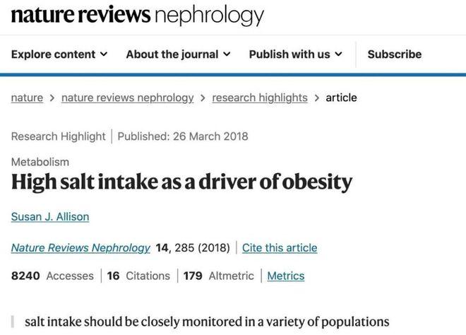 [2]Allison, S. High salt intake as a driver of obesity. Nat Rev Nephrol 14, 285 (2018). https://doi.org/10.1038/nrneph.2018.23
