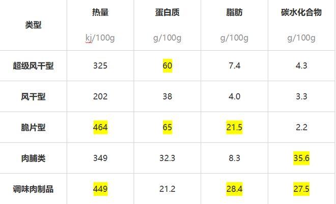 而這幾年流行起來的脆片型,雖然大多成分比較簡單、純粹,但因爲水分低、蛋白和脂肪高,所以熱量也非常高,是這些類型裏平均熱量最高的。如果你追求營養和口感,可以喫,但一定要少喫點。