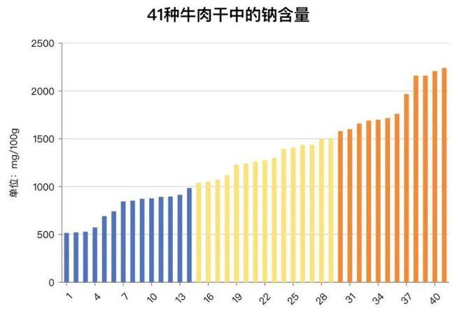 根據市面上牛肉乾的含鹽量梳理,鈉含量普遍分佈在 500~2000mg/100g 之間。這意味着,僅僅食用 100 克牛肉乾,就可能攝入高達 1.25~5 克的鹽(1 克鈉約等於 2.5 克鹽)。