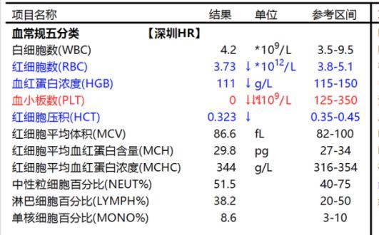 這時候隊友也到了,我們在檢驗科門口等待着。不到半小時,我就在手機上看到了自己的血常規報告,血小板數竟然是0(正常範圍125~350×10⁹/L)。我和隊友討論說:“難道是數據太離譜了,他們選擇不顯示?”很快我們就遠遠聽到了門診醫生在叫我的名字。