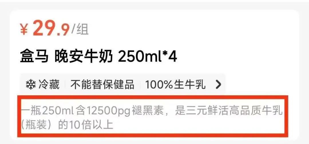 上面提到的“晚安牛奶”還有一個槽點:包裝上寫着“每瓶含褪黑素12500pg”。
