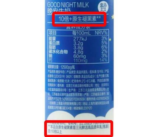 產品包裝上寫着“10倍原生褪黑素”,看着很多!但轉動一下瓶身看背面小字,“本品含原生褪黑素是三元鮮活高品質牛乳(瓶裝)的10倍以上”——原來是和普通牛奶比褪黑素含量,但普通牛奶的主要營養是蛋白質和鈣,裏面本來也沒啥褪黑素,哪怕多出100倍,總量也微乎其微啊!