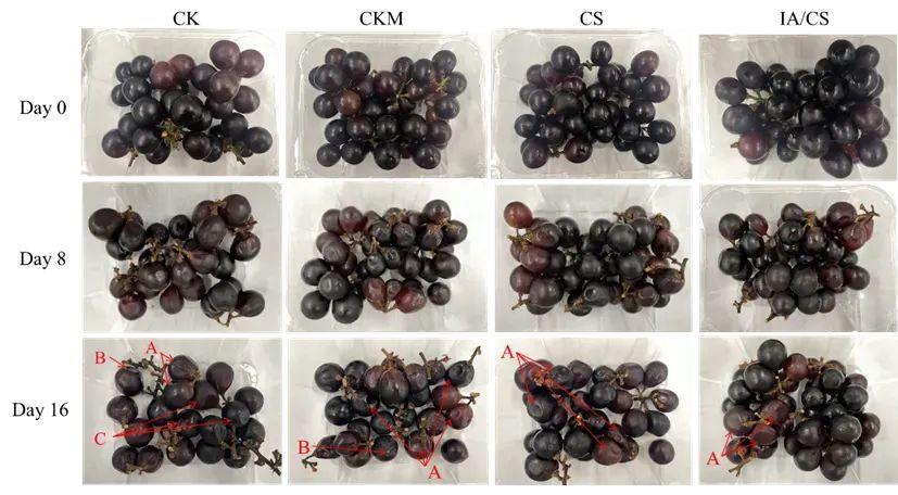 IA/殼聚糖納米微膠囊對巨峯葡萄常溫貯藏的保鮮效果 CK、CKM、CS、IA/CS 分別爲清水對照組,空載殼聚糖納米微膠囊處理組,高濃度殼聚糖溶液處理組、IA/殼聚糖納米微膠囊處理組。A、B、C 箭頭分別指示儲存後葡萄果粒表面凹陷,果粒表面黴斑及腐敗,果粒脫落。圖片來源:參考文獻[1]