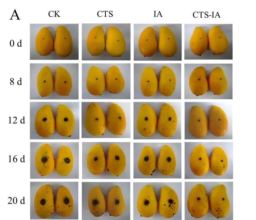 IA/殼聚糖複合膜對臺農芒果冷庫貯藏的保鮮效果 CK、CTS、IA、CTS-IA分別爲清水對照組,殼聚糖溶液處理組、IA 溶液處理組,IA/殼聚糖複合膜處理組。圖片來源:參考文獻[2]