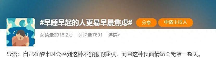 今日,#早睡早起的人更易早晨焦慮# 話題登上微博熱搜,引發廣大網友關注。那麼,早睡早起的人,真的更易早晨焦慮嗎?