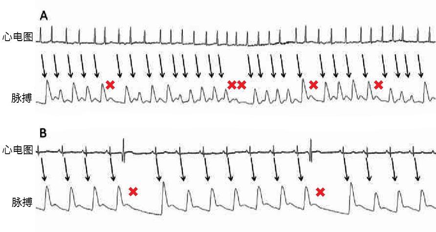 A爲房顫心律,B可見室性早搏,均可見心電圖上兩次心跳距離近時,脈搏次數少於心跳(脫漏脈搏標記爲紅叉) | 參考文獻[9]