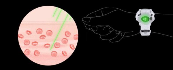 手測脈率是直接觸摸動脈跳動來計數,可穿戴設備是通過檢測血液吸收光線的量,來計算動脈血流量變化,然後推算脈率。戴上智能手錶,表背面的LED燈就會向手腕發出綠光、紅光或紅外光,血液吸收一部分光,又將其餘的光反射回手錶。動脈變粗時,血液吸收光量變大、反射光量減少。於是,不斷測量反射光的量,追蹤動脈粗細變化,就可以計算出動脈搏動的頻率。通常,這個頻率就等於心率。
