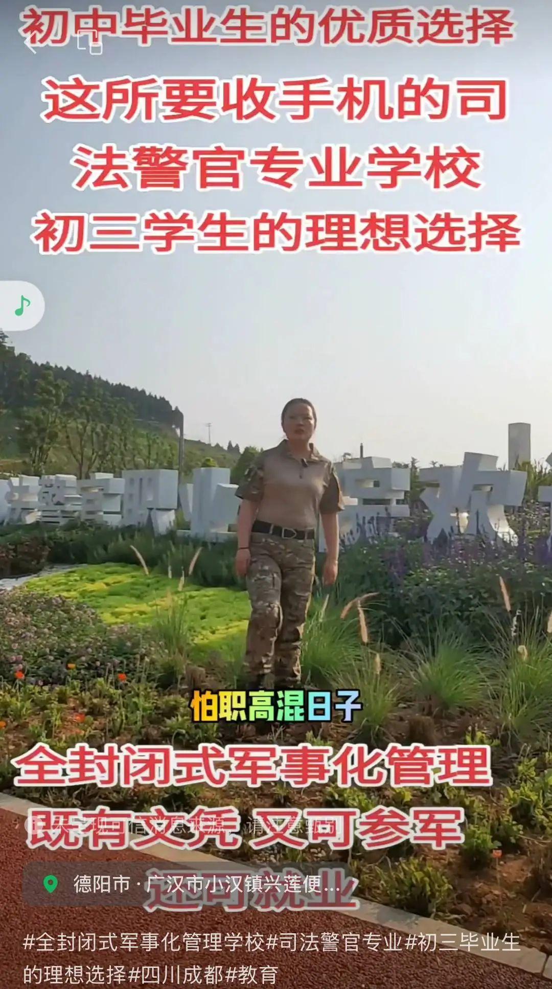 視頻中的女子身穿迷彩服,站在四川司法警官職業學院立體名稱標識前,配上“對口考入”等宣傳語,讓很多家長看了十分心動。