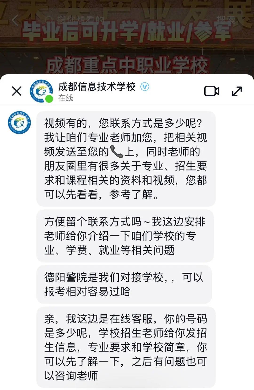 據所謂的教育諮詢老師介紹,這所名爲“成都信息技術學校”的民辦綜合性中等專業學校,不僅不限分數、不限戶籍、面試入學,而且還是四川司法警官職業學院的生源基地,畢業後既有文憑、又可參軍,還能就業。