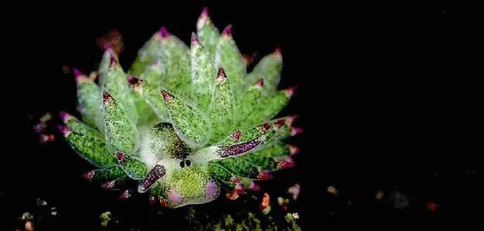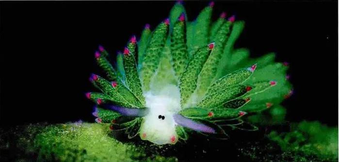 這些像多肉葉片一樣的綠色“毛髮”是葉羊的消化道細胞,葉羊剛被孵化出來的時候,這些消化道細胞是透明的,當葉羊發現可口的藻類,就會用類似銼刀的特殊攝食器官齒舌,像切牛排一樣優雅地將藻類切割成小塊,然後像吸果凍一樣吸食裏面的營養物質。