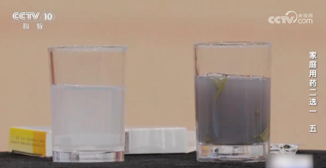 左邊杯子裏是白開水,右邊杯子裏是茶水,他們將琥珀酸亞鐵片研碎,分別放進兩個杯子,結果茶水那邊發生了反應,茶水的顏色變得渾濁。顯而易見,茶水送服藥物必然會影響藥效。