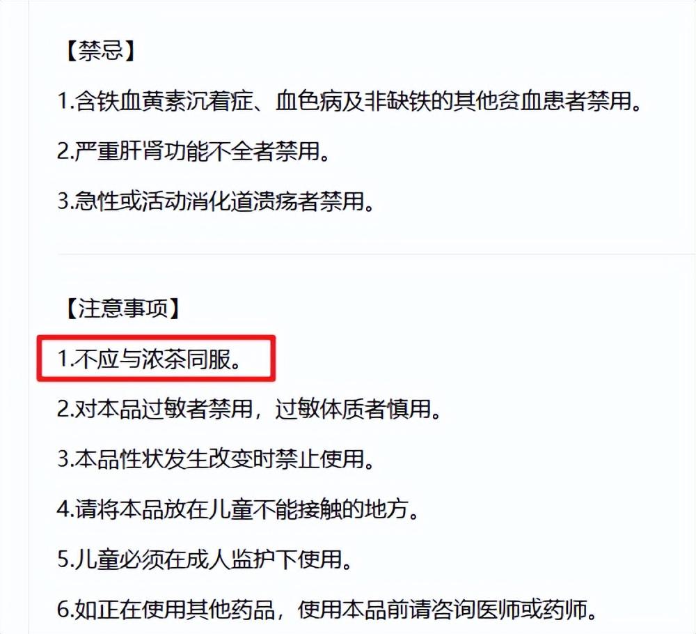 我們知道許多藥物中都含有較多的金屬離子,比如補鐵、補鋅、補鈣等礦物質的各類營養補充藥物,再比如硫酸鎂鋁等抗胃酸藥物。《中國藥典臨牀用藥須知》中指出,鐵離子與茶水中的鞣酸可形成不溶於水的鞣酸鐵沉澱,大大阻礙藥物在腸道的吸收,從而影響補鐵製劑的藥效,影響缺鐵性貧血的治療效果。