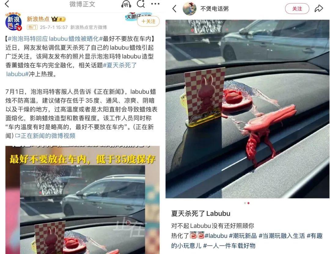 前些天就有一位網友的labubu蠟燭在車內被曬成了一攤泥。