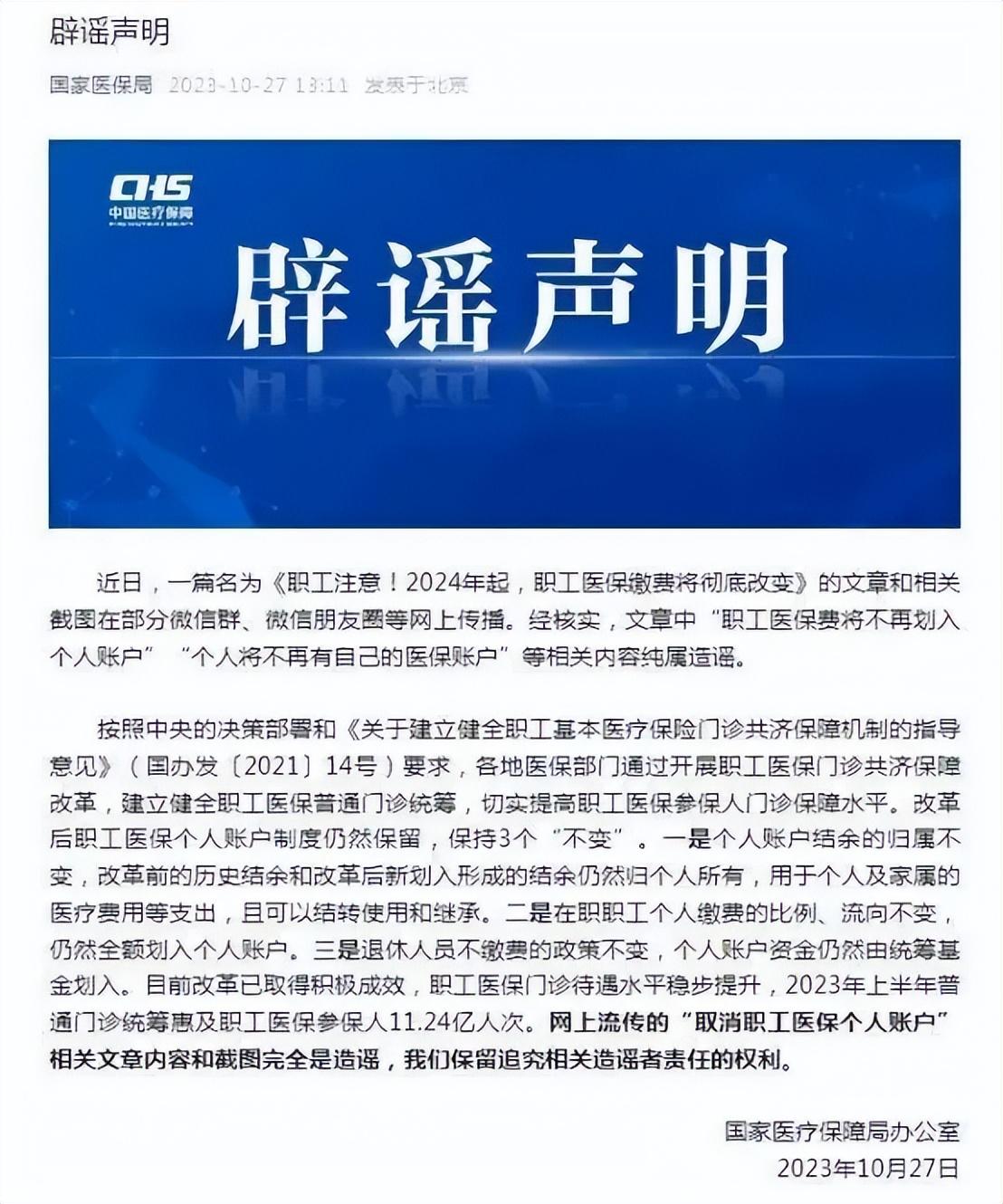 對此,中國互聯網聯合闢謠平臺向有關部門查證得知,相關文章中“‘個人賬戶’將全部取消”“全國範圍內全面取消個人賬戶,所有醫保繳費全部進入統籌基金,建立全國統一的醫療保障積分系統”等內容純屬謠言。