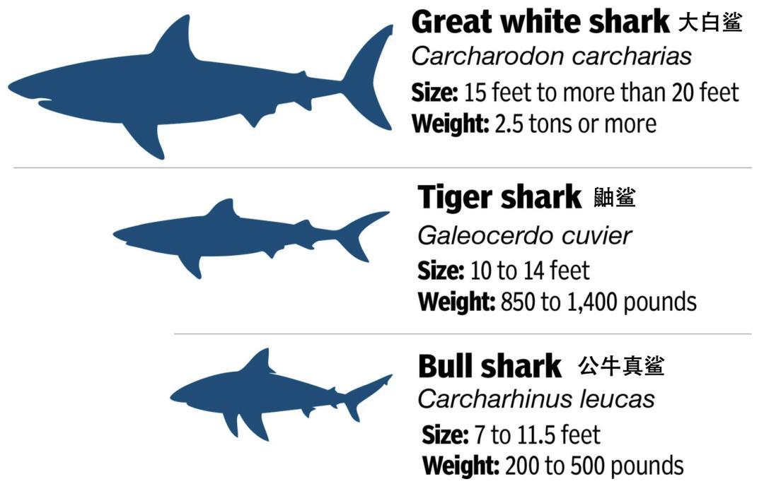 鯊魚有超過500個物種,其中絕大部分沒有襲擊人類的記錄。威脅人類安全的主要是大白鯊(Carcharodon carcharias)、鼬鯊(Galeocerdo cuvier)和公牛真鯊(Carcharhinus leucas)三種。 | USA TODAY