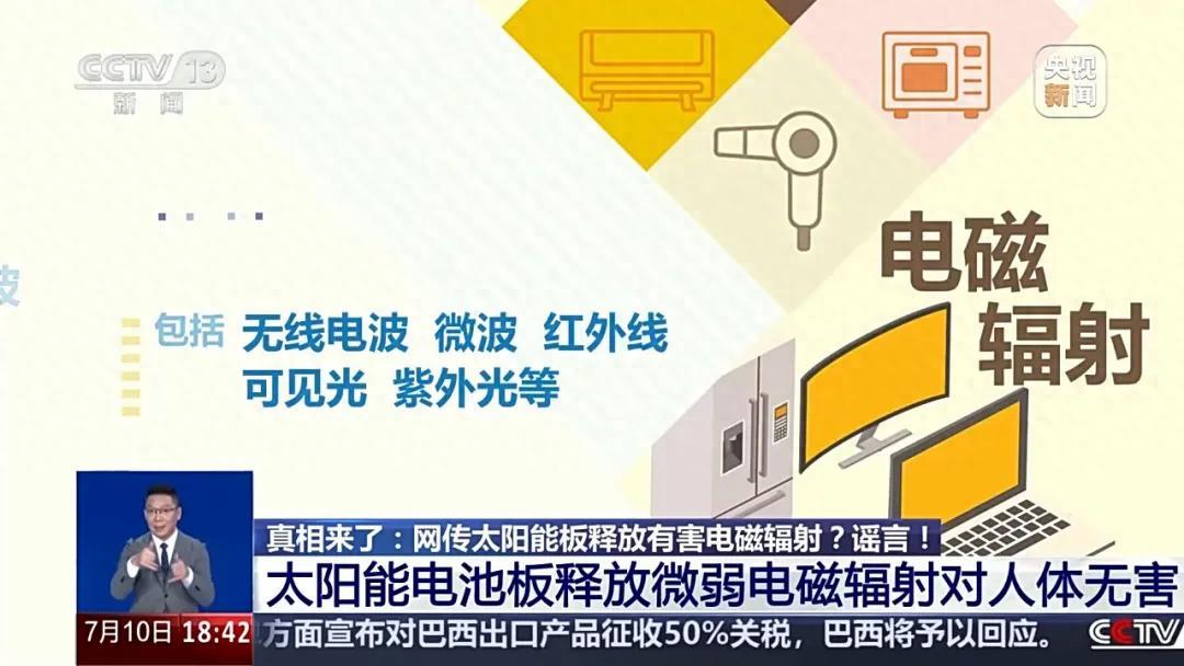 國家統計局數據顯示,2024年,我國太陽能電池產量達6.8億千瓦,同比增長15.7%。日常生活中,我們身邊的太陽能發電裝置也越來越多。然而在網上流傳着這樣一種說法,稱“太陽能板會釋放有害電磁輻射,對人體造成傷害”。這種說法有科學依據嗎?近期,由北京市科協、北京市委網信辦等單位聯合發佈的“科學”流言榜,對這一問題進行了科學闢謠。一起揭開真相↓