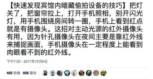 許多網帖稱,手機自帶的相機可以識別間諜攝像頭。只要打開對準房間的角落繞一圈,哪裏有紅點哪裏就有問題。從貼文裏相差無幾的內容就能看出,這是智能機時代(2008年)前誕生的經驗,一路複製粘貼到今天。