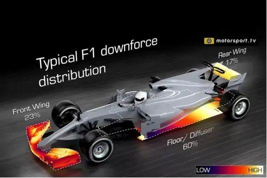 F1賽車的極速接近300km/h,在這種條件下,空氣動力的影響已經不容忽視。此時的賽車,已經不再是我們日常認知中的“汽車”,而更像是一種貼地飛行的機器——“地效飛行器”。只不過與飛行器追求“升力”不同,賽車追求的是“下壓力”,目標剛好相反。