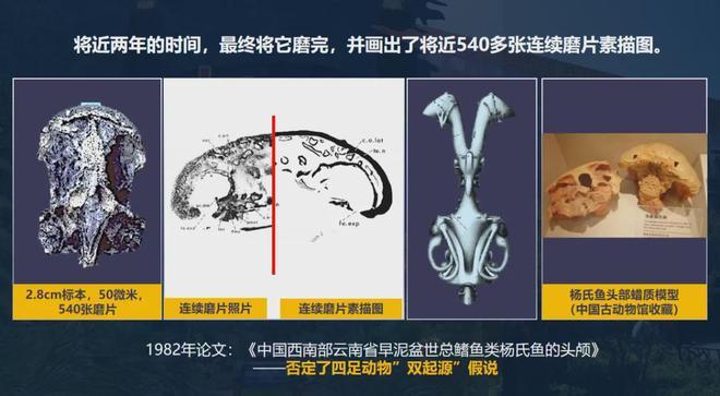 比如張彌曼老師對楊氏魚的研究。她在瑞典花了將近兩年的時間,用當時最爲先進的連續磨片法,把不到 3釐米的魚頭標本磨成了 500 多張片子,然後對它的腦顱結構進行研究。