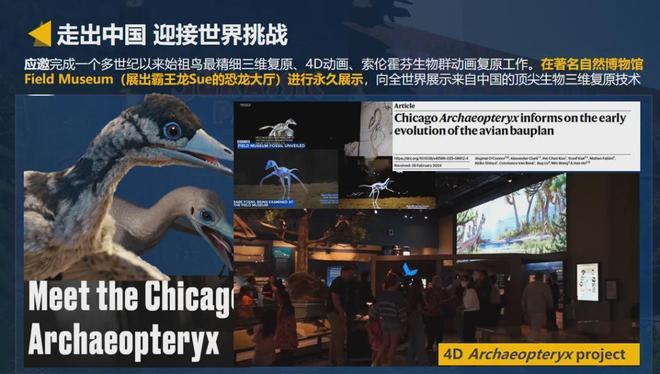 去年,我們與美國芝加哥菲爾德自然歷史博物館(Field Museum)合作,完成了一項重要的展覽工作:對世界上第一隻鳥——始祖鳥,進行了高精度三維復原。在這次復原中,我們幾乎復原了始祖鳥的全部骨骼、羽毛、皮膚和肌肉結構,實現了迄今爲止全球精度最高的一次科學復原。通過這項工作,我們不僅將中國的古生物復原技術推向了國際前沿,也讓世界看到了中國科研團隊在這一領域的卓越實力。