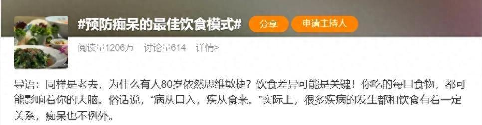 近日,#預防癡呆的最佳飲食模式# 話題登上微博熱搜,引發廣大網友關注。該模式推薦了 7 類“防癡呆黃金食物”:綠色蔬菜、漿果、柑橘類水果、禽肉、蛋類、馬鈴薯、橄欖油。此外,甜飲料要完全限制。