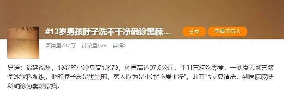 由此可見,這個熱搜的來龍去脈,我們也算是大概瞭解了:孩子因爲有肥胖,引發了皮膚的黑棘皮病;而肥胖的原因,可能是暴飲暴食(也可能還有別的原因),食物本身和黑棘皮病沒關係。
