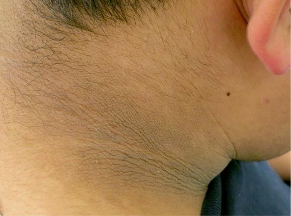 “髒頸徵”的外觀特點是脖子(尤其是前面或側面)是瀰漫性褐色或暗沉的斑片,表面可能伴有輕微粗糙或細小的皮屑。除此之外,患者皮膚本身容易有乾燥和瘙癢的表現,其他部位(比如手腕、手肘、腿彎)可能有反覆長溼疹的情況。