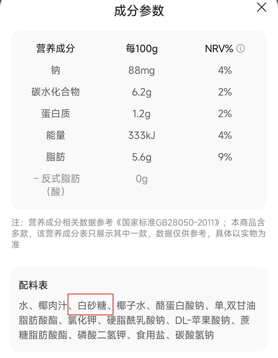 網上不少博主復刻生椰拿鐵,用的就是厚椰乳加咖啡液,而根據京東上某銷量100萬+的厚椰乳配料表,厚椰乳裏除了水、椰肉汁、椰子水等,還有白砂糖等多種配料。
