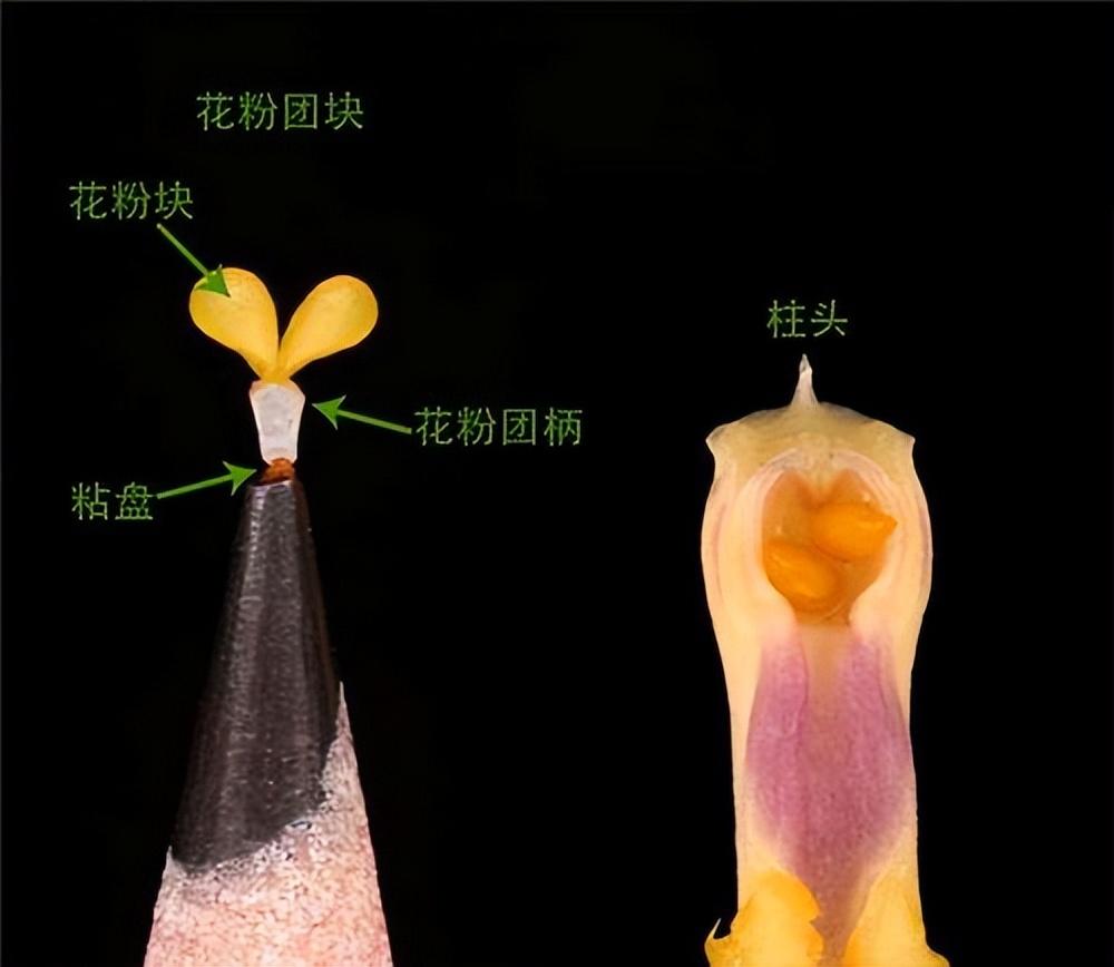 缺少胚乳的蘭科植物也有自己的辦法,它們大膽創新,將花粉粒粘合成塊,形成花粉塊,花粉塊不會像花粉那樣漫無目的、廣撒網式的散播,而是可以附着在授粉昆蟲身上在花朵間進行一對一的傳粉。花粉塊的形成,是蘭科進化史上的一項關鍵創新,不僅促成了生殖隔離,有助於新物種的形成,還在該種羣的輻射分佈方面發揮重要作用。