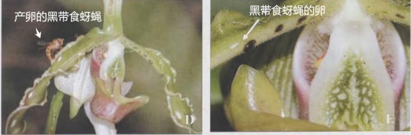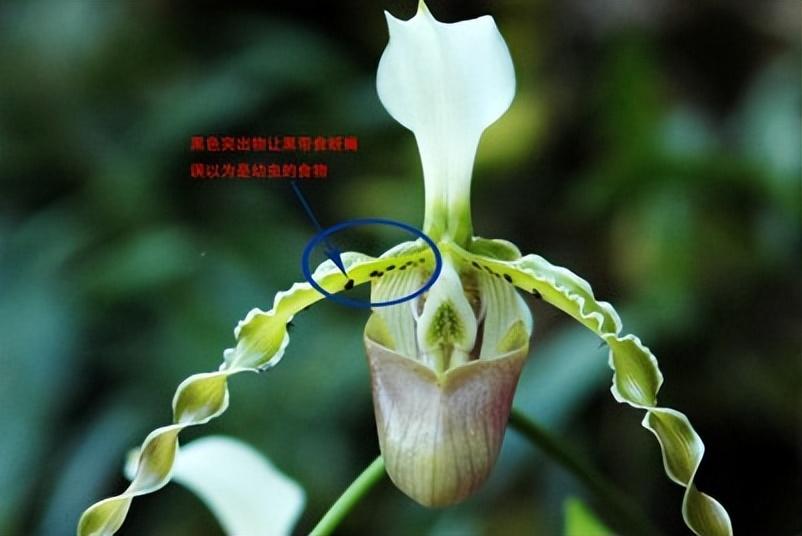 長瓣兜蘭利用花瓣上的黑色突出物模擬黑帶食蚜蠅的幼蟲食物,讓黑帶食蚜蠅母親誤以爲這是食物豐富的哺育場所,興高采烈地前來產卵,在產卵過程中爲長瓣兜蘭完成授粉。